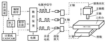 圖5.4.8為數控機床的原理示意圖,首先根據零件圖的加工要求編制加工工藝,然后編制加工程序,再通過鍵盤或其他輸入設備送入數控系統,經修改、調試后儲存。加工時,數控裝置按所編制的程序發出指令,通過步進電機轉換成電機軸的旋轉運動,經過扭矩放大裝置和滾珠絲杠副驅動工作臺和主軸箱及主軸按照加工所需要的運動規律運動,完成對工件的加工。其工作過程大致可分為3次轉換。