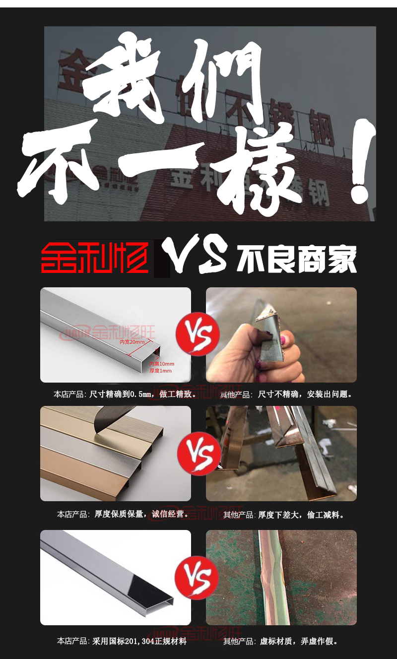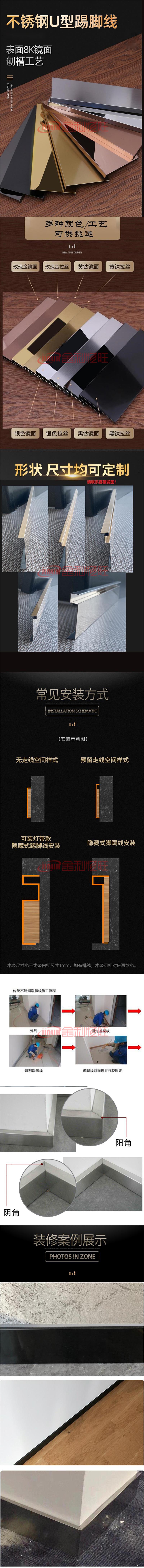 304香檳金拉絲不銹鋼踢腳線(xiàn) 2021-05-1516:44:47304香檳金拉絲不銹鋼踢腳線(xiàn)已關(guān)閉評(píng)論品名:不銹鋼踢腳線(xiàn)? ??廠家:金利恒不銹鋼材質(zhì):201不銹鋼,304不銹鋼;? ?常用厚度:0.65mm,0.75mm,0.85mm,1.2mm等 ;高度:10cm,8cm,5cm等皆可定制;顏色:白拉絲,黑鈦,灰鈦,鈦金,玫瑰金,香檳金,古銅色等。表面工藝:拉絲,鏡面,噴砂,亂紋 不銹鋼門(mén)套踢腳線(xiàn)視頻 贊 1 分享