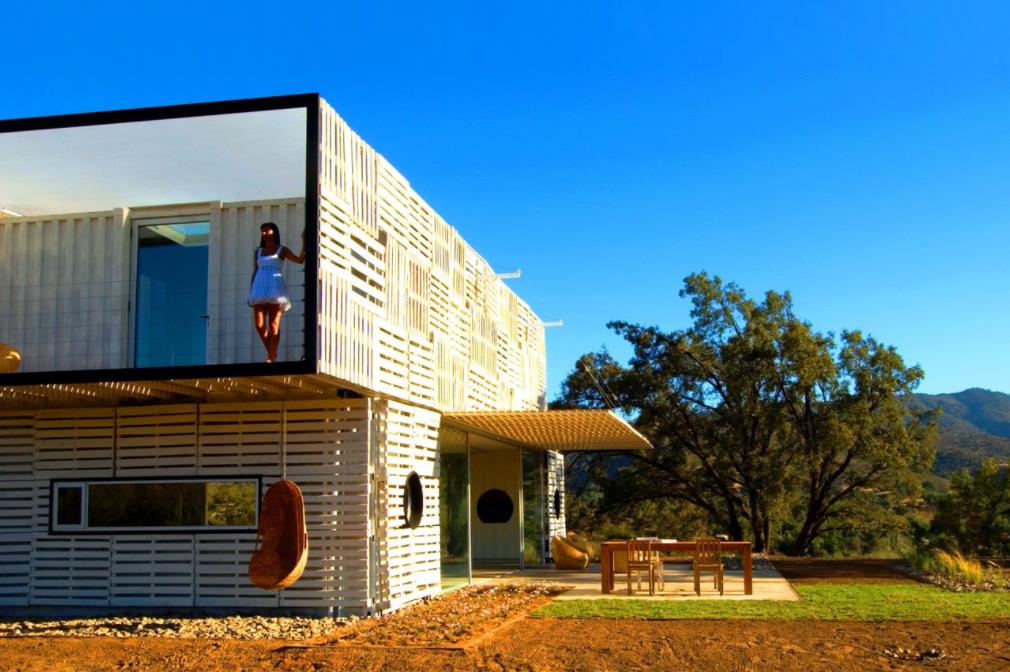 另一個智利美女, 宣言之家, 比其他制造鋼結(jié)構(gòu)房屋的例子要模糊一些。立面上覆蓋著回收的木制托盤, 以保護墻壁不受陽光的傷害,并在冬季保持溫暖的空氣。盡管它的尺寸很大,但它只使用了三個海運集裝箱,間隔開來,用玻璃板和其他材料連接在一起,給人一種開闊的感覺。并且主要使用太陽能發(fā)電供電。