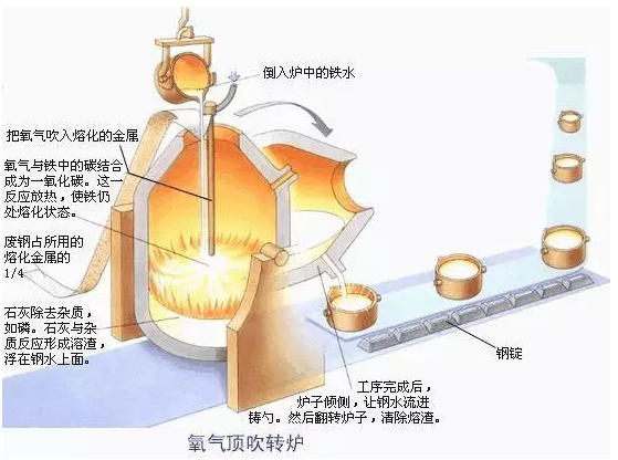 生鐵中的各種雜質(zhì),在高溫環(huán)境下,不同程度上都與氧有較大的親和力。因此可以利用氧化的方法使它們成為液體、固體或氣體氧化物,液體和固體氧化物在高溫下與爐襯和加入爐內(nèi)的熔劑進行反應(yīng),結(jié)合成爐渣,并在扒渣時被排除爐外,氣體也在鋼水沸騰時被CO帶到爐外。
