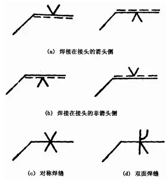 基本符號(hào)相對(duì)基準(zhǔn)線(xiàn)的位置見(jiàn)圖1—27(a)、(b)、(c)、(d);標(biāo)注對(duì)稱(chēng)焊縫及雙面焊縫時(shí),不加虛線(xiàn)。