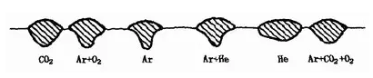 (6)保護(hù)氣體成分??氣體保護(hù)焊時(shí),保護(hù)氣體的成分以及與此密切相關(guān)的熔滴過(guò)渡形式對(duì)焊縫形狀有明顯影響。采用不同保護(hù)氣體進(jìn)行熔化極氣體保護(hù)焊直流反接時(shí),焊縫形狀的變化,見(jiàn)圖1—35。射流過(guò)渡氬弧焊總是形成明顯蘑菇狀焊縫,氬氣中加入O2、CO2或H2時(shí),可使根部成形展寬,焊縫厚度略有增加。顆粒狀和短路過(guò)渡電弧焊則形成的焊縫形狀寬而淺。