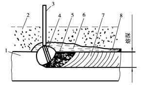 1—工件 2—焊劑 3—焊絲 4—電弧5—熔池 6—熔渣 7—焊縫 8—渣殼