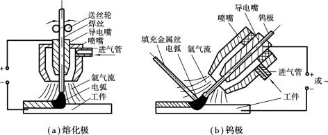 氬弧焊按所用電極的不同可分為不熔化極氬弧焊和熔化極氬弧焊兩種,如圖4.1.7所示。